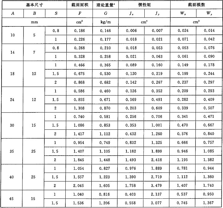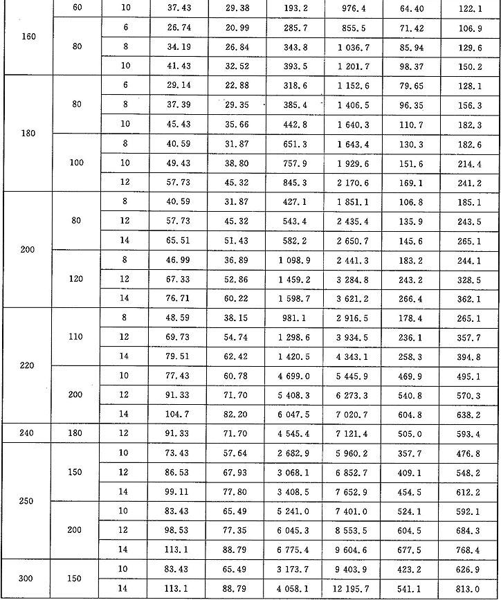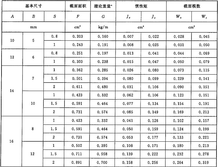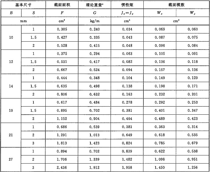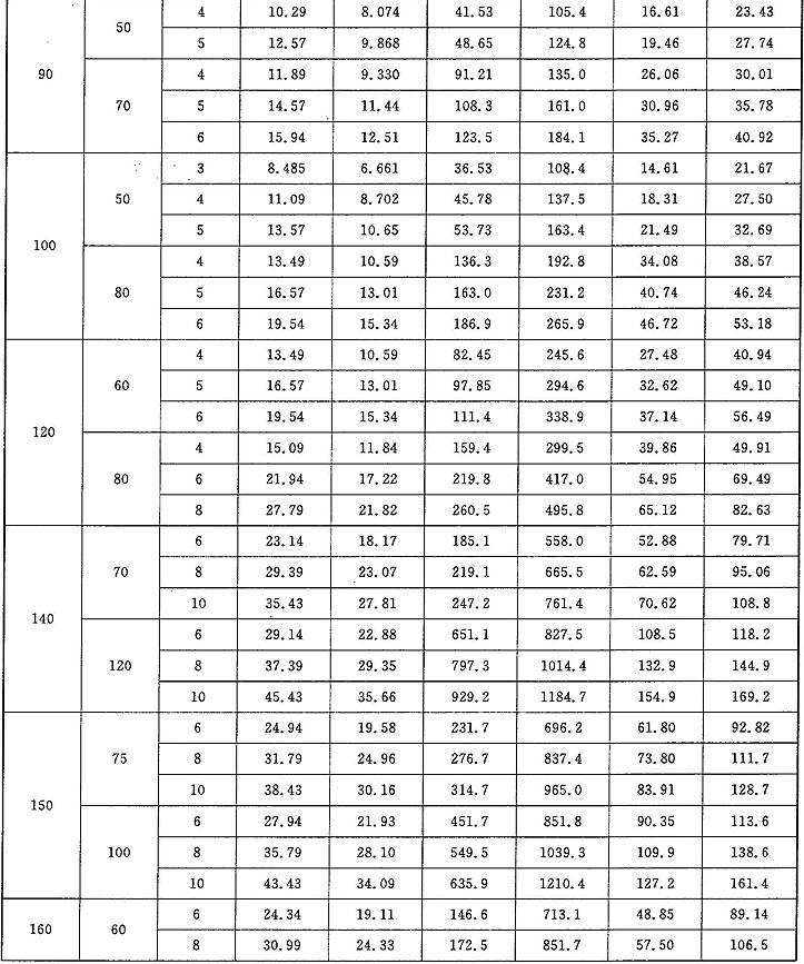 表A.1 方形鋼管的尺寸、理論重量和物理參數