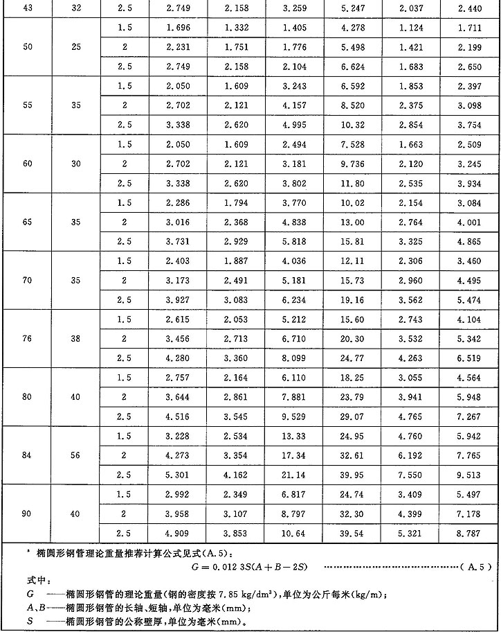 表A.3 橢圓形鋼管的尺寸、理論重量和物理參數