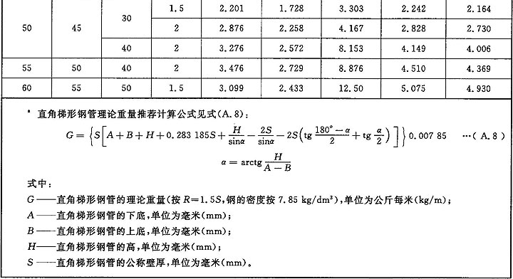 表A.6 直角梯形鋼管的尺寸、理論重量和物理參數