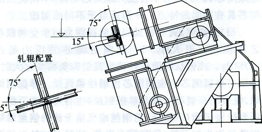 一對(duì)軋輥的軸線同水平面成15交角、相鄰的另一對(duì)軋輥的軸線同水平面成75交角、且前后機(jī)架軋輥軸線互相垂直布置的高速無(wú)扭線材精軋機(jī)組。(見(jiàn)圖)15。/75。無(wú)扭精軋機(jī)組是德國(guó)德馬克公司從側(cè)交45機(jī)型改進(jìn)而成的。高速線材精軋機(jī)組的上限速度主要受設(shè)備制造精度和機(jī)組振動(dòng)的限制。15/75機(jī)組由于將傳動(dòng)軸從原45。向下旋轉(zhuǎn)了30,從而降低了傳動(dòng)軸同基礎(chǔ)平面的距離,降低了機(jī)組重心,增加了穩(wěn)定性,減少了振動(dòng)和噪聲。該機(jī)組的最大速度可達(dá)117m/s。