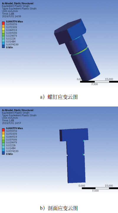 由應力云圖(見圖2)可以看出,螺釘最大等效應力為1534MPa,出現位置為第一扣螺紋底部,在塑性應變云圖(見圖3)中,最大塑性應變為6.6%,綜合以上兩個結果,螺釘在承力時,第一扣應力最大,但是應力主要集中在螺釘表面,螺釘心部應力較小,為發生塑性應變。
