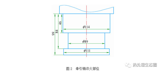 某產品牽引銷(淬火部位見圖2)為產品中的關鍵零部件,材料為40Cr合金結構鋼,要求f 89mm外圓表面高頻淬火,淬火硬度要求50~60HRC,淬硬層深度2.5~4.5mm。該工件需淬火表面尺寸較大,除需要較大的功率進行加熱外,對于加熱影響更大的問題是淬火部位為工件凹槽部,感應器的制作也是一大困難。如按常規方法制作感應器,即感應器內徑稍大于需淬火表面直徑,則感應器必須現場制作,十分麻煩,而且工件淬火必須損壞感應器才能進行,每一工件的高頻表面淬火必須制作相應的一件感應器,也存在著每一感應器的制作誤差;如感應器內徑大于相鄰截面直徑,即大于111mm,則感應器與淬火部位的間距加大了11mm,感應加熱效率將顯著降低。淬硬層方面,2.5~4.5mm的深度范圍是正常熱透入深度的2.5~4.5倍,為提高淬硬層深度,一般可適當利用熱傳導的原理,即利用熱量由表面向心部傳導的特性,加大加熱層的厚度。但單純依靠熱傳導的方法需要自表面向內存在較大的溫度差,往往要求的淬硬層深度達到淬火溫度時,表面溫度已過高,產生表面組織過熱、過燒等缺陷。
