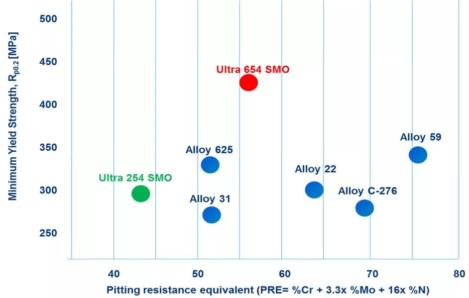 根據下表合金的抗點蝕當量-PRE值,Ultra 654SMO的耐腐蝕性能是要優于Alloy 31和Alloy 625。