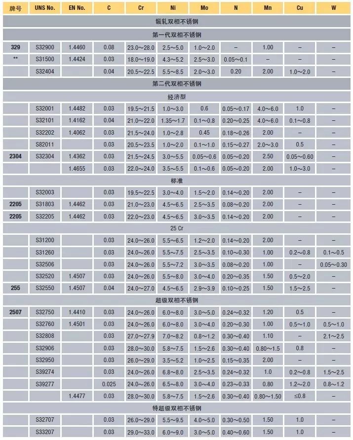 超級雙相不銹鋼(PREN值40~45), 含25%~26%Cr,與含25%Cr雙相不銹鋼如2507相比,鉬和氮的含量增加;