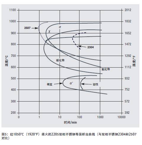 σ相和χ相析出的溫度略高但是與碳化物和氮化物析出的時間大致相同。鉻、鉬和鎳含量更高的雙相不銹鋼牌號的σ相和χ相析出比2205更快;低合金化牌號析出則較慢。圖5中的虛線說明σ相和χ相在較高合金化的2507中開始形成的時間較早,而在2304中開始時間較晚。