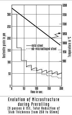 55)顯示出一種典型的軋制制度可獲得大約50μm的平均晶粒尺寸。在有鈮微合金化的情況下,可以得到更細小的晶粒尺寸。這是因為擴散控制的過程,如道次間的晶粒長大,由于鈮原子的直徑比γ-Fe原子大15.2%,擴散過程受到很大阻礙。
