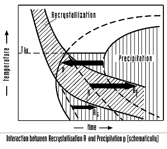這里有兩個方面的原因8:首先,固溶態下鈮原子在某種程度上會推遲再結晶的發生;還有,鈮在這樣一種位錯多的組織中將以碳化物或碳氮化物形式快速析出。這些應變誘導析出的粒子最終完全抑制了再結晶的發生。7說明了這一原理。