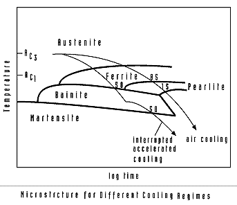 9顯示了被應用的冷卻制度:結構鋼空冷后得到鐵素體-珠光體組織,加速冷卻避免了珠光體轉變而得到鐵素體-貝氏體組織。實際上,加速冷卻一般在約550℃時終止,接下來是空冷。