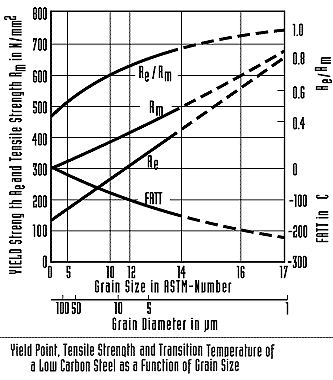由細晶粒組織導致優異的力學能力,這種高強度結構鋼可應用于惡劣的工作條件。1214給出了鐵素體晶粒尺寸對低碳鋼性能的影響。可以通過仔細控制整個生產過程中的軋制條件時間、溫度和形變來獲得晶粒細化。