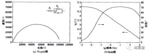 為了描述含有兩個時間常數的 EIS 結果,提出了如圖 1-1(c)所示的第三種等效電路。對于在涂層下或結垢下的腐蝕、緩蝕體系,甚至局部腐蝕,經常遇到這種情況。圖 1-1(c)中的電路元件的物理意義,會隨所代表的系統不同而有所不同。圖 1-4 是圖 1-1(c)所示等效電路的阻抗圖譜,該電路具有下列模擬數據:Rs=10Ω,R1=40kΩ,Q1=40uF 和指數 n=1.