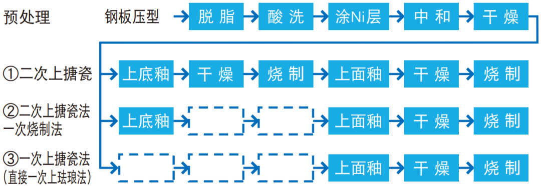 搪瓷工藝的常規(guī)生產(chǎn)工藝如下,隨著技術(shù)的進步以及環(huán)保和成本的壓力有很多工序已經(jīng)有所減少。