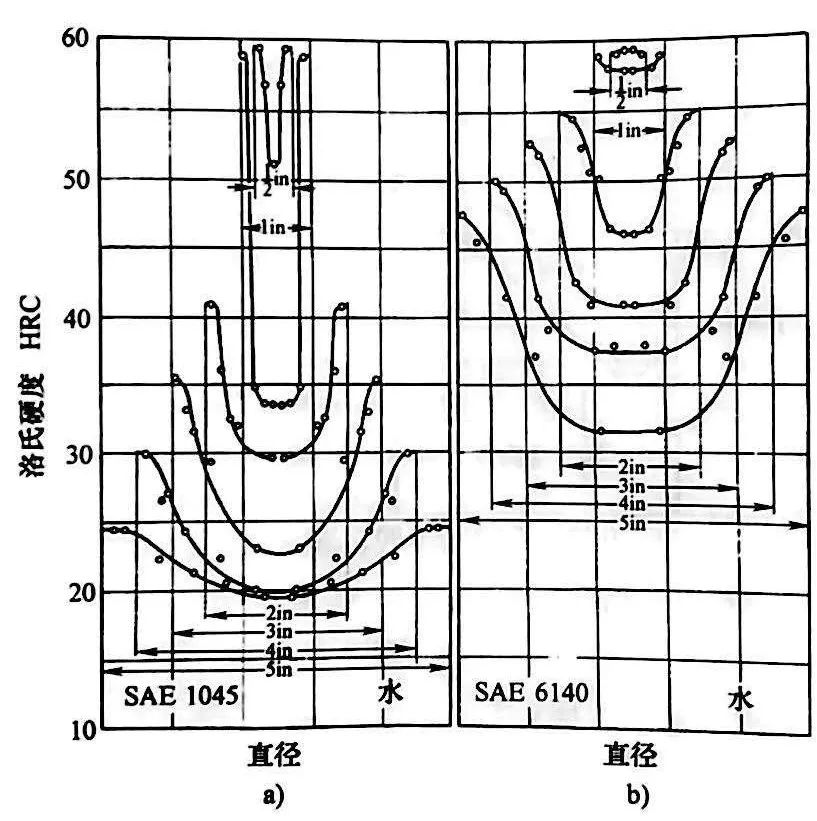對于一個給定的含碳量,當為100%馬氏體組織時,可達到最大硬度,這種組織只能從表面或小型鋼試樣的薄截面上獲得。大截面上無法達到足夠大的冷卻速度,從而無法完成100%馬氏體轉變,因此零件的馬氏體層深度和硬度會降低。