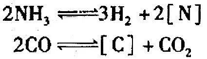 氮碳共滲所用的介質必須能在其工藝溫度下分解出活性氮、碳原子。當介質為氨氣,同時再加入放熱式氣氛或吸熱式氣氛形成混合氣氛時,會發生如下分解反應,既能提供活性氮原子,也能提供活性碳原子,從而實現氮碳原子的同時滲入:
