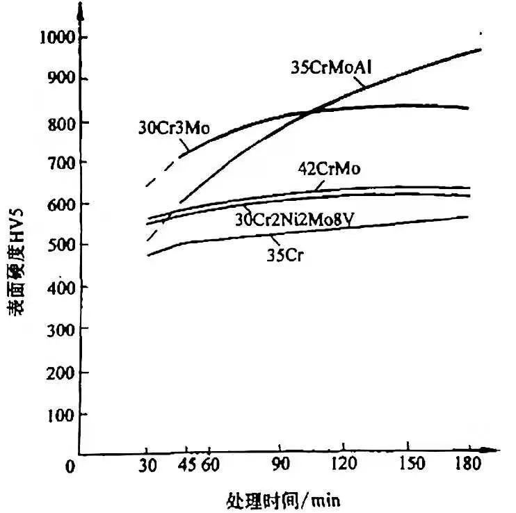 由于鑄鐵中碳、硅的含量較高,氮擴散的阻力較大,要達到與鋼同樣的滲氮層深度,滲氮時間需要比鋼增加0.5~1倍。鑄鋼中添加錳、硅、鎂、鉻、鎢、鎳、鈰等元素可提高滲氮層硬度,但會降低滲氮速度。鋁既可提高滲氮速度,又不降低滲氮硬度。