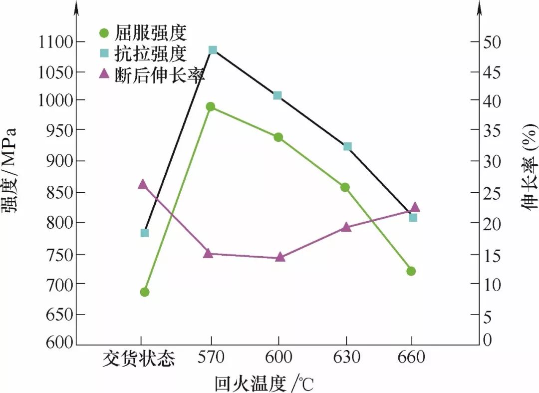 試驗用鋼在回火后力學性能變化趨勢比較一致,主要是由于回火過程中貝氏體位錯亞結構的回復軟化與碳的脫落綜合作用。試驗用鋼屈服強度隨回火溫度的升高逐漸降低,由570℃回火時的995MPa下降到630℃時的716MPa,下降了279MPa,主要是由于回火后貝氏體鐵素體中多邊形鐵素體逐漸增多,受再結晶作用影響,細小均勻的等軸晶粒逐漸長大,是晶粒粗化,使試樣用鋼的力學性能繼續(xù)降低。