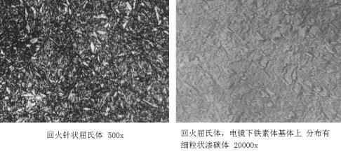 馬氏體分解得到極細的過渡型碳化物與過飽和(含碳較低)的a-相混合組織 它由馬氏體在150~250℃時回火形成。這種組織極易受腐蝕,光學(xué)顯微鏡下呈暗黑色針狀組織(保持淬火馬氏體位向),與下貝氏體很相似,只有在高倍電子顯微鏡下才能看到極細小的碳化物質(zhì)點。