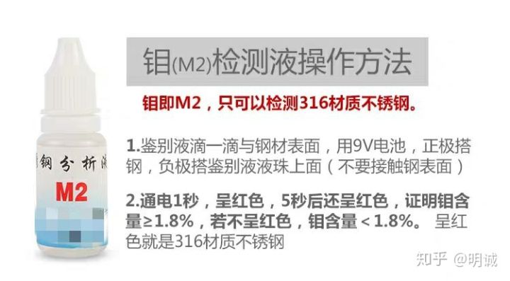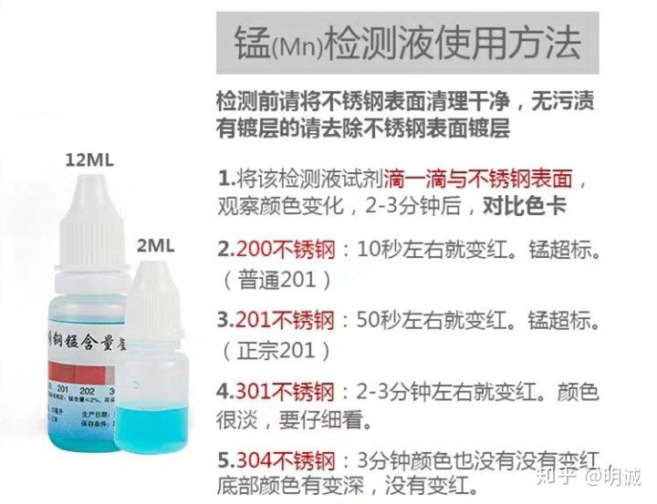 現(xiàn)在大家在網(wǎng)上可以買到很多不銹剛檢測液,這些產(chǎn)品的原理很簡單:溶液與不同種類不銹鋼的某些成分發(fā)生化學(xué)反應(yīng),使溶液顏色發(fā)生變化。檢測液通常分為兩種: