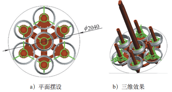 在單個軸承圈工裝設計方案確定以后,具體裝爐需結合每種爐型的實際有效區(qū)尺寸具體設計。設計原則是:充分發(fā)揮最大爐容,以提高效率;同時要控制總重,不能超過吊具負載限額。現(xiàn)以我單位450kW井式氣體滲碳爐裝爐方案的設計作一簡要介紹。前已述及,450kW井式氣體滲碳爐實際裝料應控制在φ2100×3400mm圓柱體積內。水平直徑內,經(jīng)過計算,圓周方向軸承內外圈間隔擺放,可擺放6只。中間圓心處如擺放軸承外圈,與圓周擺放的3個外圈最小間隔僅剩13mm,如用于滲碳過程,結合來料配裝,軸承在外圈比例較高時,可以在中間圓心處擺放軸承外圈;如用于滲碳后的淬火過程,考慮每只軸承圈周邊溫度場的均勻性,建議在中間圓心處擺放軸承內圈。平面擺放布置方案如圖8a所示,最大外圓直徑2040mm,沒有超出φ2100mm的最大限制。平面擺放布置方案的三維效果如圖8b所示。