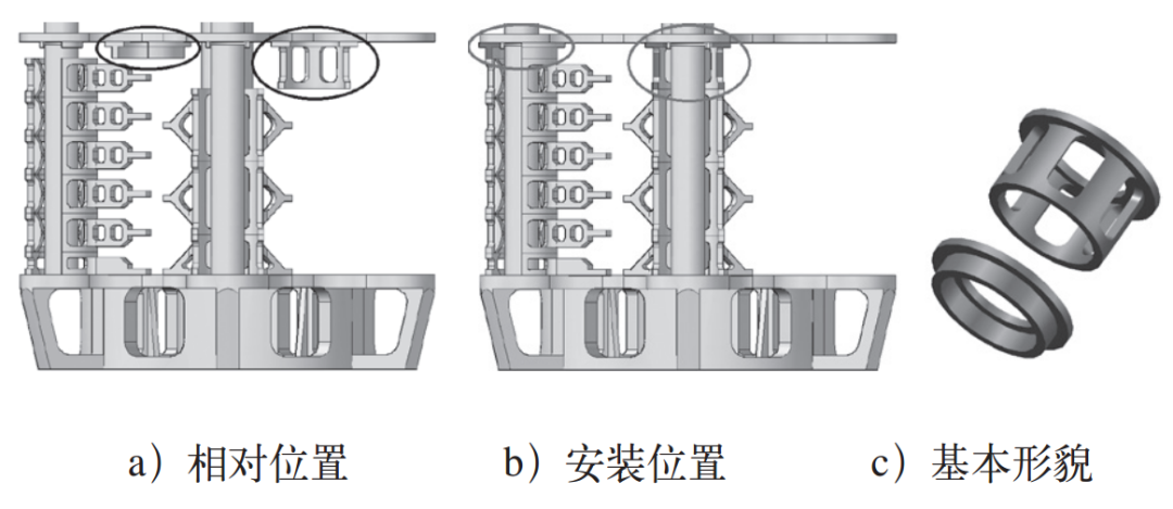 圖11中畫圈位置即為高度補償座,圖11a展示了高度補償座與其他的工裝軸向相對位置;圖11b展示了高度補償座安裝位置,圖中畫圈位置還同步展示了限制中心導向立柱自由變形的定位環(huán)與中心導向立柱的相對位置關系,以及中心導向立柱與上層托盤的相對位置關系,還展示了兩層托盤之間的相對位置關系;圖11c展示了兩種高度補償座的基本形貌。上層托架擺放時,圓周方向可以提供6個支點,加上料架中心柱的支點,同一平面內可以提供7個支點平衡載荷。沿中心立柱軸向,所有載荷均對應在各自的中心軸線上,且載荷均由軸承內圈托架和軸承外圈托架的中心環(huán)承擔,最終載荷全部傳遞至料架底座承擔,待處理工件和中心導向立柱均不承壓,且在高溫狀態(tài)時有足夠的線膨脹空間。