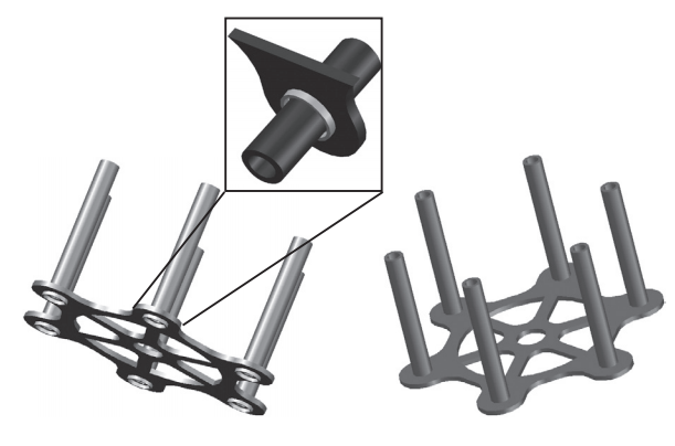 依據(jù)這一模式,高達2500mm的中心導向立柱也可以分成三段,每段800mm左右,長徑比降至7,加上中心導向立柱采用管狀結構,反復使用過程中的變形問題得到極大緩解。據(jù)此思路,在有效擺放總高2500mm范圍內,底層立柱直接焊在料架底座上,外露總高限制在800mm,上面兩層采用托盤連接結構。托盤的結構如圖10所示。采用一個大的底托作為承載平臺,6根中心立柱焊在對應的位置,底托下部對應位置焊有一個限制下一級中心導向立柱自由變形的定位環(huán),其作用方式如圖10中局部放大的小圖所示。