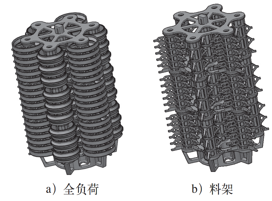 圖5c方案在熱爐試裝期間發(fā)現(xiàn)兩個問題:①支撐肋發(fā)生了較大的變形,如圖5d所示。②中心環(huán)內徑過大,穩(wěn)定性比較好,但一旦發(fā)生歪斜,中心環(huán)保持穩(wěn)定作用不明顯。針對上述兩個實際出現(xiàn)的問題,對圖5c方案結構進行了改進:將中心環(huán)的3個不帶托架支臂的支撐肋改為T形結構,向中心方向凸出30mm高的肋條,肋條沿縱軸方向設計為圓弧。該方案的改進依據(jù)是:1)支撐肋高溫下變形較大主要是肋的強度不足,以及沿徑向肋橫截面形狀為簡單矩形,彎、扭變形抗性較差,最終變形主要發(fā)生在3個不帶托架支臂的支撐肋上,變形主要表現(xiàn)為外鼓和扭傾。為了在加強肋條的同時,盡量減輕肋條增重的影響,考慮將支撐肋的橫截面形狀改為T形截面,這樣可以使較小的截面獲得較好的支撐效果。2)主要對3個不帶托架支臂的支撐肋進行加強。如圖5c、圖5e所示,帶托架支臂的支撐肋實際是一個三角穩(wěn)定結構,沿軸向傳遞的壓力一部分由縱向肋所承擔,另一部分由交叉于一點的托架支臂承擔,其承載力遠高于托架支臂的支撐肋。實際試裝中,3個帶托架支臂的支撐肋也確實產少產生變形。3)3個不帶托架支臂的支撐肋改為T形結構,向中心方向凸出30mm高的肋條后,最小內徑由210mm減小至150mm,而中心導向立柱外徑115mm,單邊間隙縮小至20mm以下,中心環(huán)沿徑向竄動的尺度大為減小,從而提高了中心環(huán)沿徑向的穩(wěn)定效果。4)加強肋沿軸向設計成圓弧形,擴大了中心環(huán)的入口尺寸,提高了中心環(huán)與中心導向立柱的導向性,方便了現(xiàn)場裝料。橫截面尺寸的縮減主要發(fā)生在中心環(huán)的端環(huán)部位,既不影響軸向強度,還有一定的減重效果。最終的設計如圖5e、圖5f所示,三維效果如圖5g所示,最底層托架采用平面坐底設計,如圖5h所示。