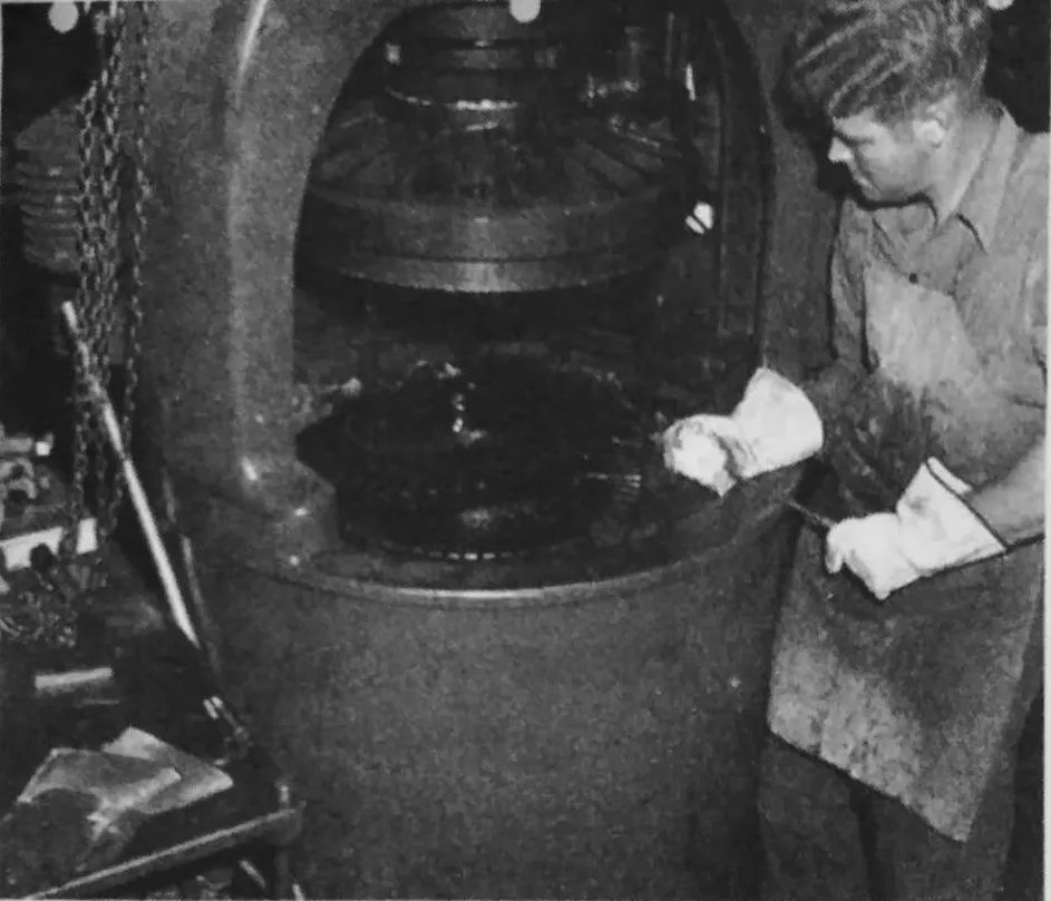 注:由紐約羅徹斯特格利森(Gleason) 工廠于1930年代早期制造。操作人員正在將一個完成淬火