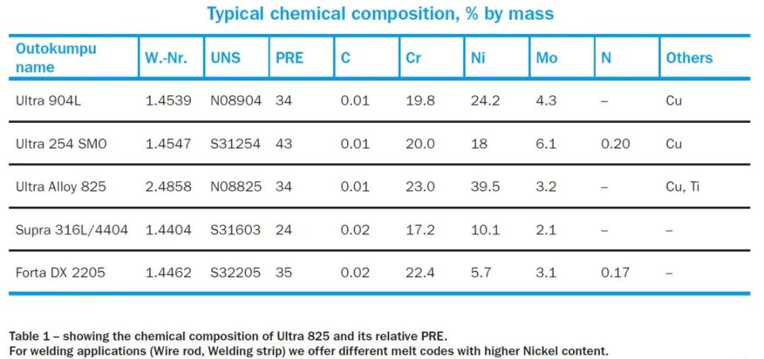 見右表2。盡管如此,在這些條件下要獲得較高的耐腐蝕性能,我們建議使用Ultra 254 SMO。這是一種特殊合金,廣泛用于長期暴露于海水,煙道氣和漂白劑的環(huán)境中,例如船用脫硫,紙漿和造紙行業(yè)等。