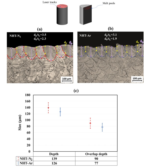 圖4。熔池尺寸測量;該示意圖顯示了具有激光軌跡方向的最后一個打印層。(a)NHT-N 2標本中的熔池形狀/大小,(b)NHT-Ar標本中的熔池形狀/大小,以及(c)測量的熔池深度和重疊深度