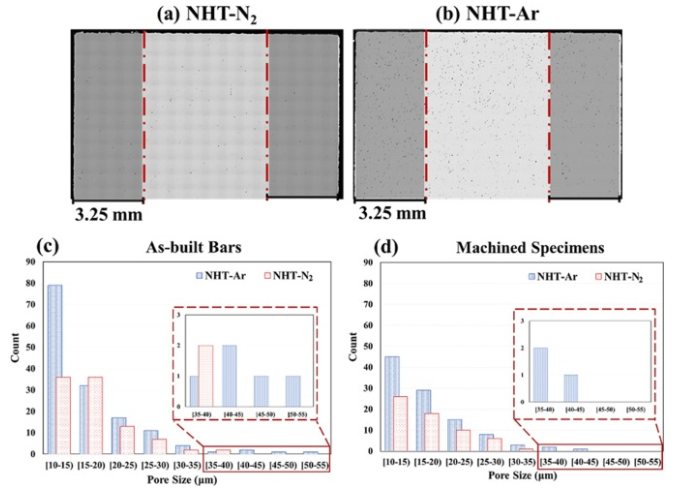 圖5。對于(a)NHT-N 2和(b)NHT-Ar標本,平行于構建方向的橫截面中的孔隙率分布。(c)預制棒和(d)機加工試樣的應變計截面中NHT-N 2和NHT-Ar試樣的孔徑的統計分布。(a)和(b)中的陰影區域表示通過機械加工去除了所有拉伸和軸向疲勞試樣的部分。