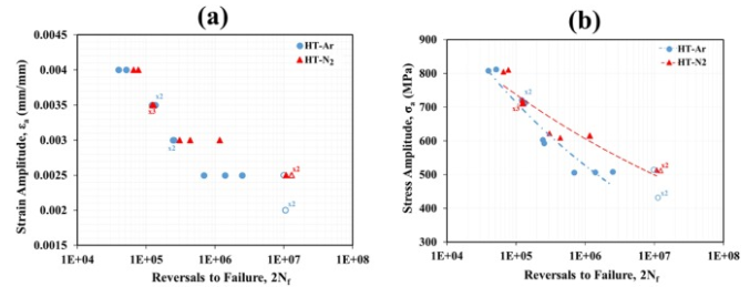 與HT-Ar相比,HT-N2樣品中較細的板條馬氏體降低了材料應變硬化的可能性,并導致較低的真實斷裂應力。當使用N2作為保護氣時,低循環疲勞中LB-PBF 17-4 PH SS的軸向疲勞性能適度提高,而在高循環疲勞中則顯著提高。在N2保護氣體下制造的LB-PBF 17-4 PH SS的耐疲勞性的提高歸因于微結構/缺陷結構的細化。