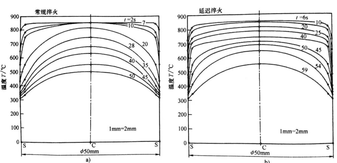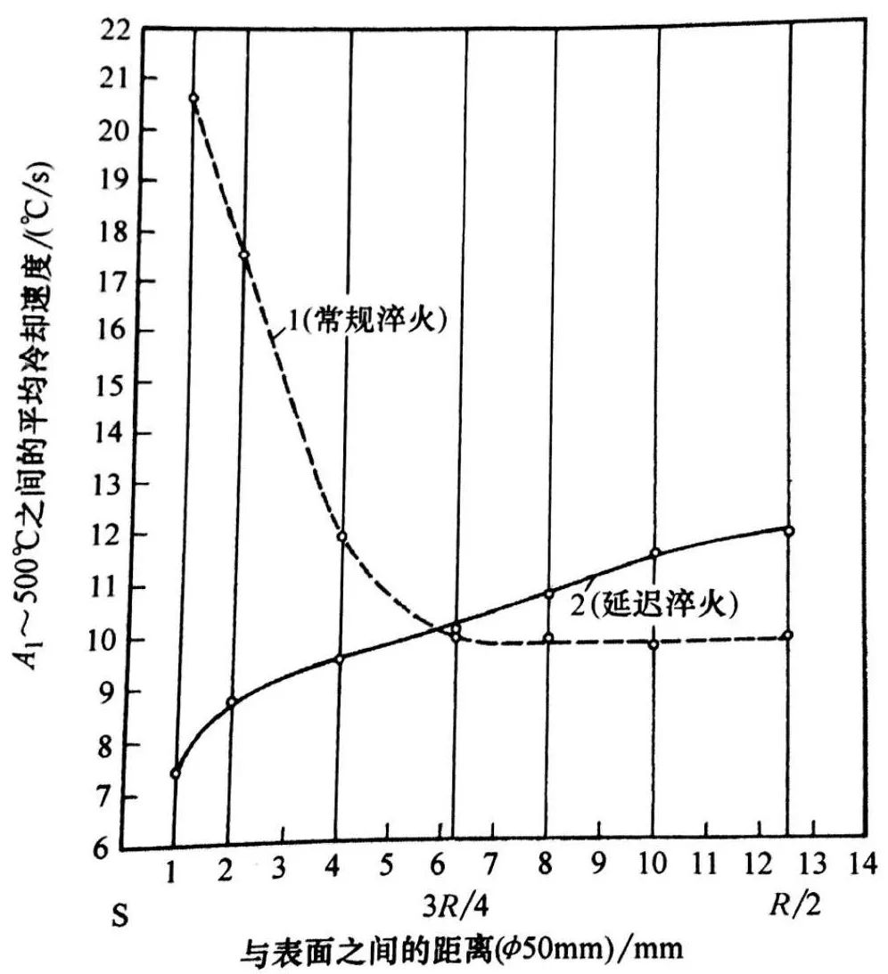 2)常規淬火,A1 到500℃的關鍵溫度范圍內的平均冷卻速度從表面到中心是降低的;而在預冷淬火中,它是增加的。