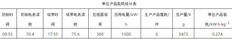 每公斤產(chǎn)品能耗:總用電量/產(chǎn)品總重量=1500/5472=0.274kW·h /kg