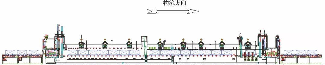 (1)設(shè)備由三工位上料臺(tái)、前真空鎖氣室、加熱保溫區(qū)、中間門、等溫球化區(qū)、降溫區(qū)、后真空鎖氣室、三工位卸料臺(tái)組成,設(shè)備全貌見圖1。