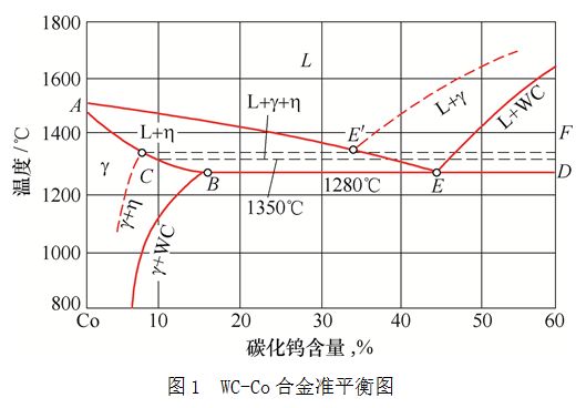 有人曾對不同C/W比為5%~35%WC的WC-Co合金的粘結相進行了研究,得出的結論是:慢冷時合金中產生γ相或(γ+WC)相;快冷時則有(γ+η)相出現。但由于(γ+η)相是不穩定的,所以經退火后(γ+η)相將轉變為穩定的(γ+WC)相。根據試驗結果繪制出如圖1所示的準平衡相圖(實線為穩定系統相圖,虛線為說明準穩定相η特性的局部相圖)。