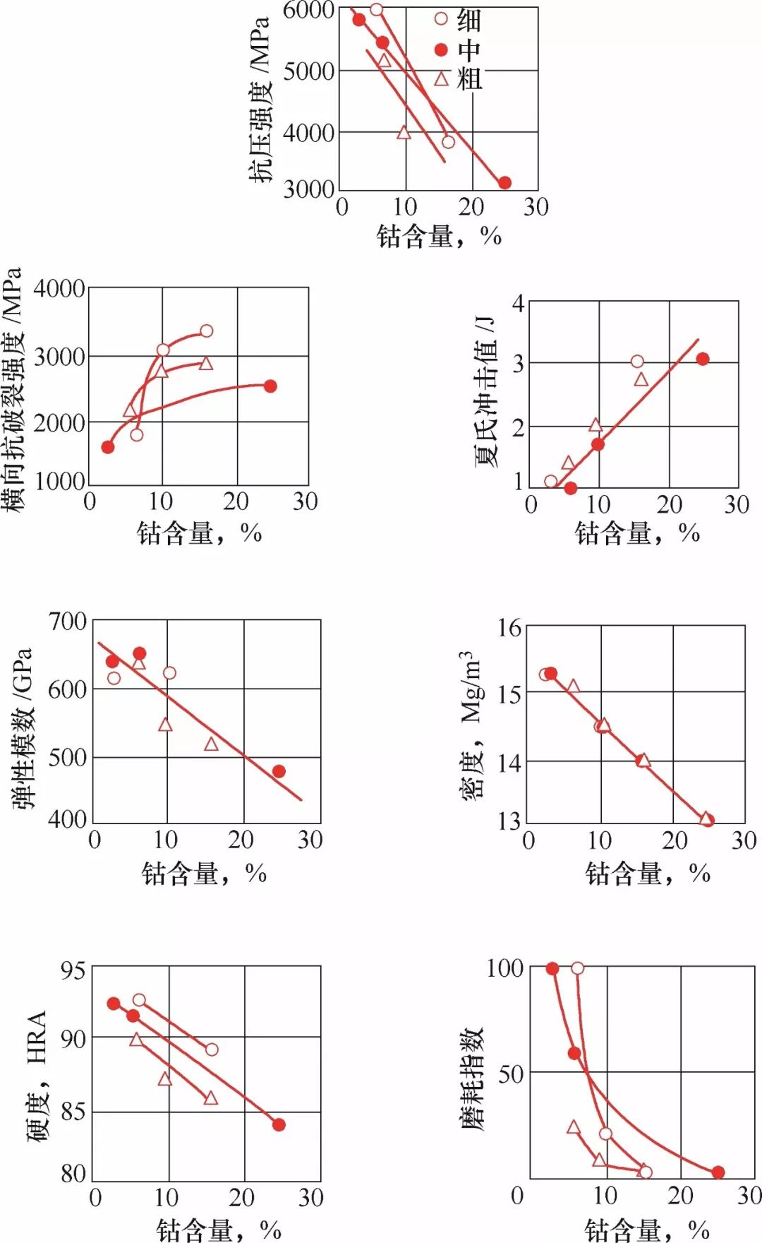 圖4  WC硬質合金的性能隨含Co量和晶粒粗細而變化