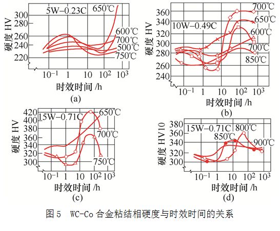 WC-Co合金時效時因有 Co3WCX和接近于Co3WCX致密組織相析出,因此合金的硬度會提高,但在隨后轉變為Co3W析出時合金的硬度則會降低。H·Jonsson實驗資料如圖5、圖6所示。