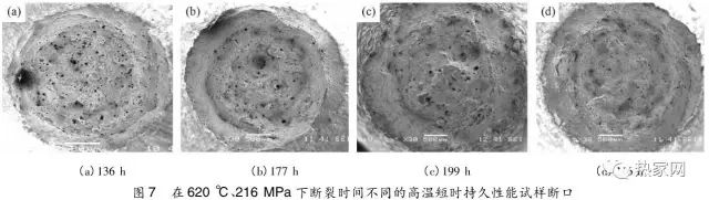 熱處理研發難度大,掌握熱處理就是掌握市場競爭力的核心要素。例如高壓轉子,我們團隊研究了幾年,熱處理后會出現不同的情況,有一個轉子很奇怪,只有一個位置強度特別低,其他位置都很好,低的地方,經過分析,原來是局部鍛造加熱過燒(見圖3)。還有時候,熱處理后的組織中出現金屬間化合物(見圖4),因為這種轉子材料之所以能用到600℃,是靠加合金元素,但是有時候合金跑到金屬間化合物中,只有經過正確的熱處理把金屬間化合物消除,固溶體才能發揮耐熱性,使合金元素溶入。有時上一輪按照這個工藝做,性能好好的,現在一輪不行了,經過我們長時間分析,偶然發現有個黑點,這個黑點是非金屬夾雜,從這里打探針,發現它的鈮含量特別高(見圖5),附近則貧鈮(見圖6),邊上一大圈熱強度降低,在620℃拉伸的時候,出現一個個空洞。同時我們也注意到,空洞的數量和斷裂時間呈反比(見圖7)。所以說也只有控制了氧含量和非金屬夾雜物,并且進行正確的熱處理,才能得到合格的產品。