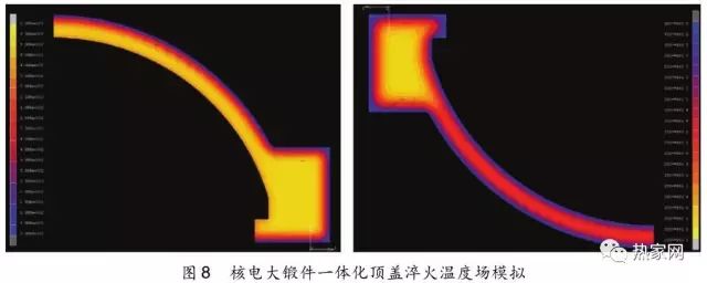 如圖8所示的核電大鍛件一體化頂蓋,重65噸。需要保證在得到性能合格的同時盡可能減少畸變,用虛擬生產研究淬火冷卻方法,確定了內外側比較均衡的冷卻方案,使得第三代核電站AP1000機組大鍛件熱處理合格交貨。