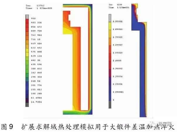 另外一個例子,是12500噸鋁型材擠壓機活塞,為了提高耐磨性,要求表面硬度大于50HRC。設計部門選取45鋼制造,用45鋼做成那么大的東西,不能淬火怎么辦呢?后來上重廠一起和經過很長時間的考慮采用計算機模擬的方法(見圖9),提出了一個差溫加熱工藝解決了生產上的難題。