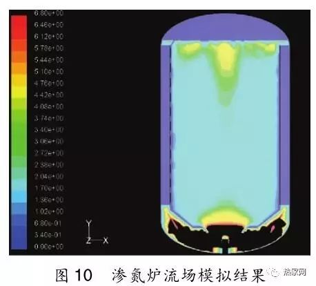 熱處理不僅僅是工藝問題,熱處理設備也很重要。原來一個大型的氮化爐,流場不均勻,而采用計算機模擬的方式改進了旋轉風葉,邊上加了導流板,上面加了分流板,這樣模擬出來流場,工作區域是均勻的(見圖10)。