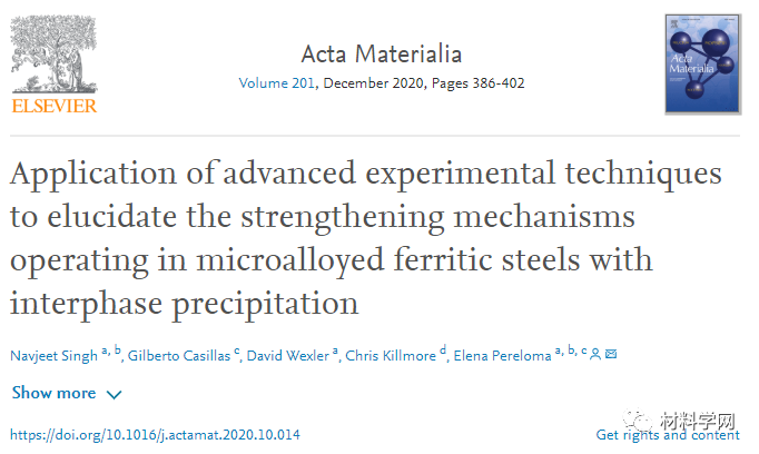 基于此,本文采用Mo、Cr、V、Nb進(jìn)行微合金化,比較不同合金化組合物的效果。此外,通過利用先進(jìn)的實驗技術(shù)(高分辨率掃描透射電子顯微鏡(HRSTEM)和原子探針斷層掃描(APT)),深入了解不同操作機(jī)制對強(qiáng)度的貢獻(xiàn)。相關(guān)研究成果以題“Application of advanced experimental techniques to elucidate the strengthening mechanisms operating in microalloyed ferritic steels with interphase precipitation”發(fā)表在金屬頂刊Acta materialia上