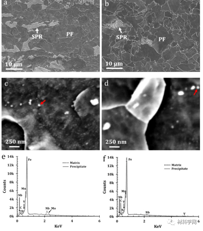 圖1  MoCrNbV(a,c)和VCrNb(b,d)鋼微觀組織的掃描電鏡照片及粒子(e,f)的EDX譜圖。c和d中的紅色箭頭分別表示e和f中獲取edx光譜的粒子。SPR代表第二階段區(qū)域。