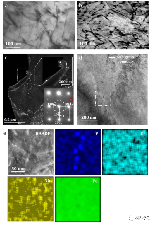 圖2  (a-b)MoCrNbV鋼和VCrNb鋼的明場區(qū)域透射電鏡照片,顯示了鐵素體中的位錯結(jié)構(gòu)。(c)暗場(DF)透射電鏡和(d) BF顯微照片顯示相對粗大的隨機(jī)MC碳化物可能起源于奧氏體。(e)亞晶界析出物d區(qū)放大矩形區(qū)域的HADDEF-掃描投射電子顯微圖和相應(yīng)的STEM-EDS分析圖。