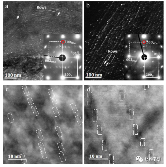 圖3 DF (a)MoCrNbV和(b)VCrNb鋼的TEM圖顯示了在鐵素體中的相間析出。插圖中顯示了相應(yīng)的衍射圖案,并用紅圈標(biāo)出了用于形成每個顯微圖像的斑點。(c,d)STEM顯微照片分別記錄了(c)MoCrNbV和(d)VCrNb鋼中行的排列細(xì)節(jié)。