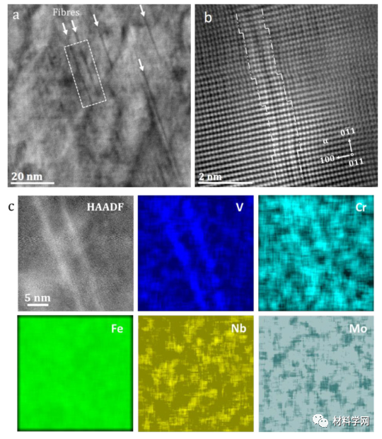 圖5  VCrNb鋼中的纖維析出:(a)BF-STEM顯微照片顯示了幾個平行纖維。(b)STEM-HAADF顯微圖基體/纖維顆粒界面臺階顯微照片。(c)HAADF-STEM顯微圖和圖(a)中被選中的對應(yīng)的平行纖維STEN-EDS圖譜??臻g軸是[011]。