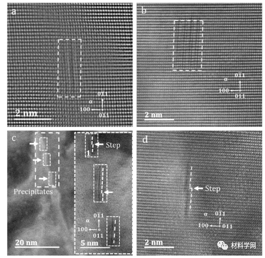 圖6  具有代表性的α/MCα 界面(a)MoCrNbV鋼和(b)VCrNb鋼的顯微圖像。在單軸拉伸變形后VCrNb鋼中相間析出的(c)STEM-HAADF圖和(c)中放大的矩形區(qū)域1。所有顯微圖都在[011]區(qū)域軸上成像。