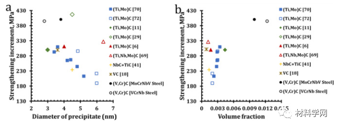 圖11  估算主要由相間析出作為(a)沉淀物大小和(b)沉淀物體積分?jǐn)?shù)的函數(shù)的沉淀強(qiáng)化