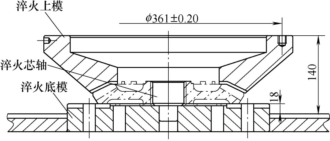 (1)淬火模具的設(shè)計(jì)  設(shè)計(jì)齒輪的淬火模具,應(yīng)考慮以下兩方面因素,即齒輪內(nèi)、外緣的蓄熱量之比與齒輪內(nèi)、外緣的單位表面積散熱量之比;調(diào)整控制齒輪內(nèi)、外緣的淬火介質(zhì)的流量。