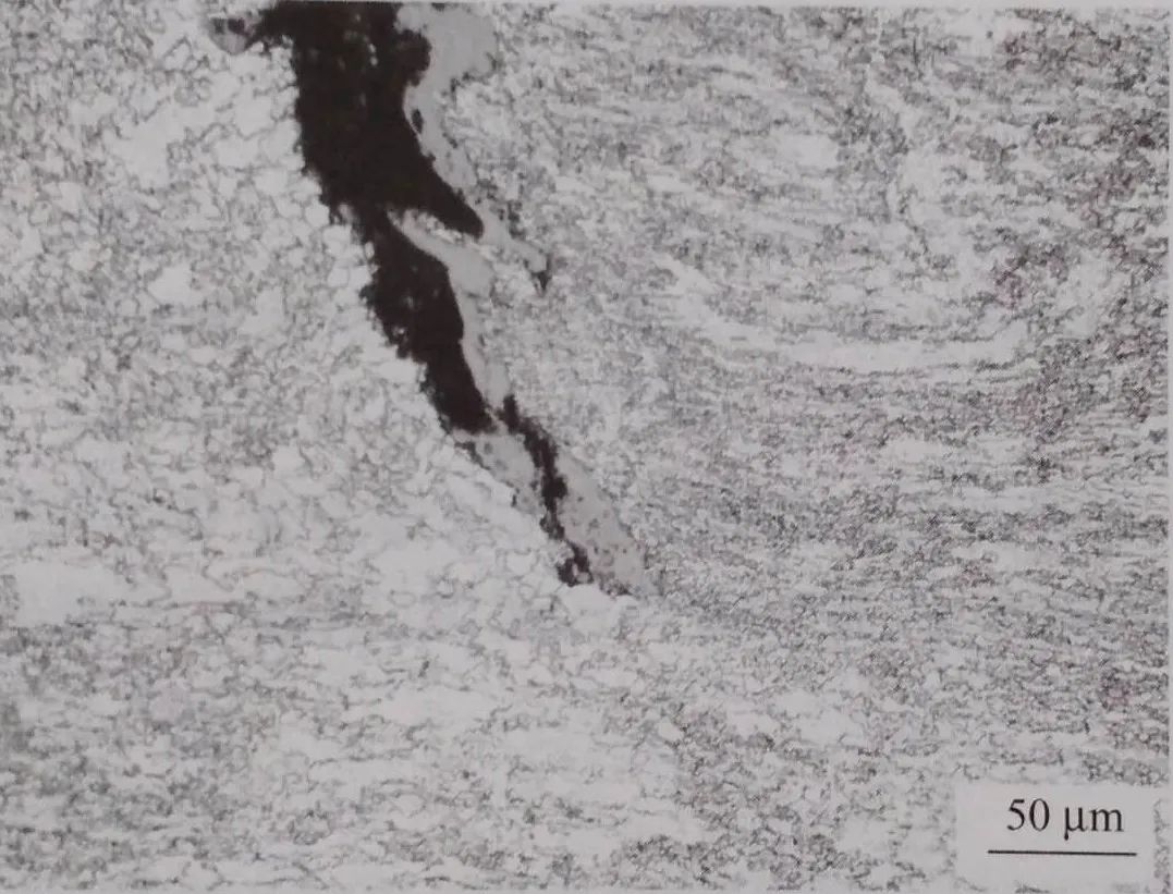 取鋼板縱截面試樣觀察,缺陷在拋光面上呈裂紋形態,裂紋靠板面一側及延伸處有一些條狀氧化鐵和密集分布的氧化圓點(圖1-57a、b) , 該側組織脫碳嚴重且有明顯的形變特征,見圖1-58。