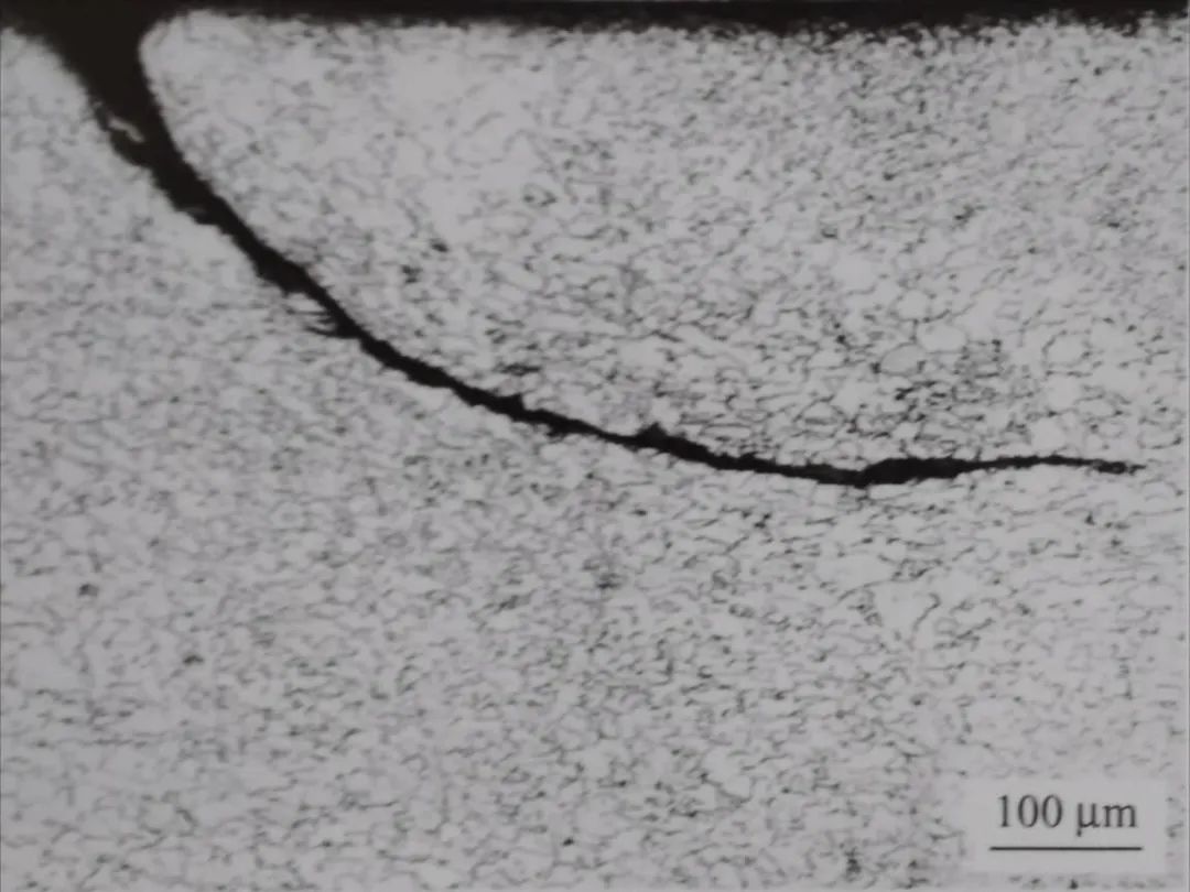 0.7mm, 附近無高溫氧化特征。經試劑浸蝕后,裂紋兩側的組織及晶粒表現出明顯不同的兩個部分,見圖1-71, 圖中裂紋上側鐵素體晶粒明顯粗大,下側晶粒十分細小且組織具有顯的方向性。